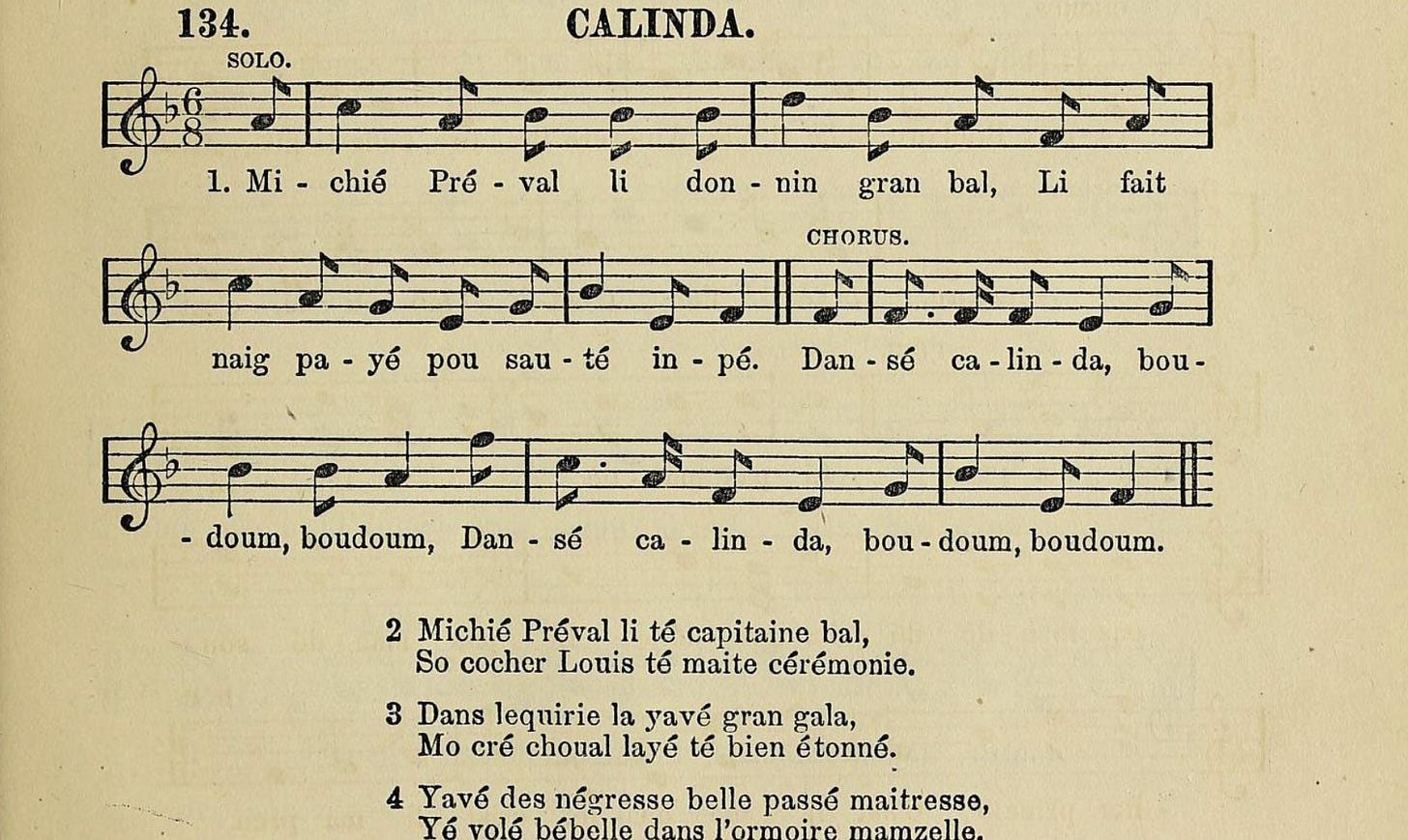 The editors write that Calinda was a sort of contra-dance, which has now passed entirely out of use. They also partially cite Louis-Nicolas Bescherelle’s definition of the “Calinda,” which reads: Danse des nègres créoles en Amérique, qu’ils exécutent rangés sur deux lignes en face les uns des autres, avançant et reculant en cadence, et faisant des contorsions fort singulières et des gestes fort lascifs. Dance of the creole Blacks in America (meaning people of African descent born in the Americas), which is executed in an orderly way with two lines, one facing the other, advancing and retreating in rhythm, making very unusual contortions and very lascivious gestures.